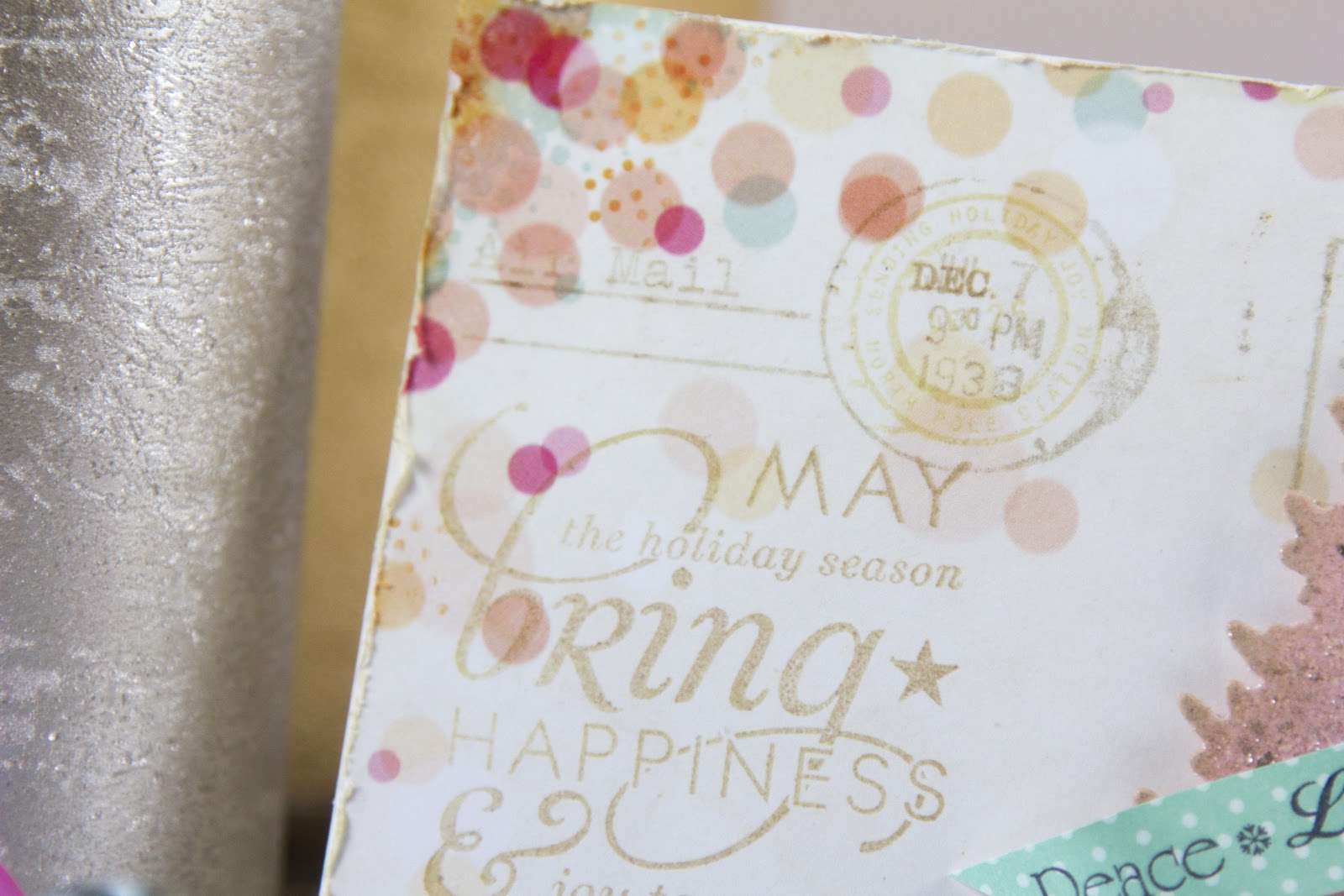 postage elements from PTI’s Postmarks and 2010 Holiday Tags using Fine Linen ink to add some extra interest to the background.