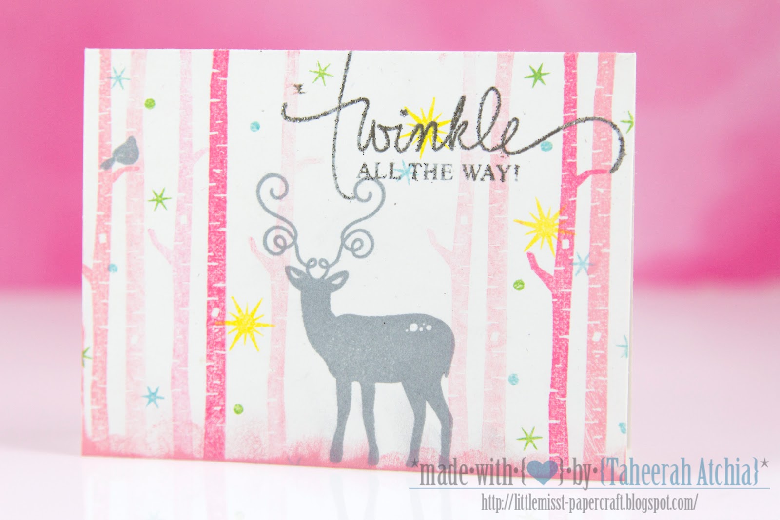 Totally loving the pink trees and the bright pops of color with the other small stamps!