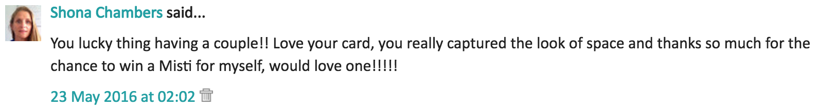 Congrats, Shona! I would be just sick if I missed out on realizing I won a Mini MISTI. Still a few not identified so I'm praying I still have a chance. ?